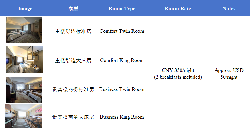 For the convenience of conference participants, the conference has reserved a number of rooms at Hilton Changshu (常熟龙腾希尔顿酒店) and Changshu Yucheng Hotel (常熟虞城大酒店). Details of the room types, rates, and booking methods are provided below.