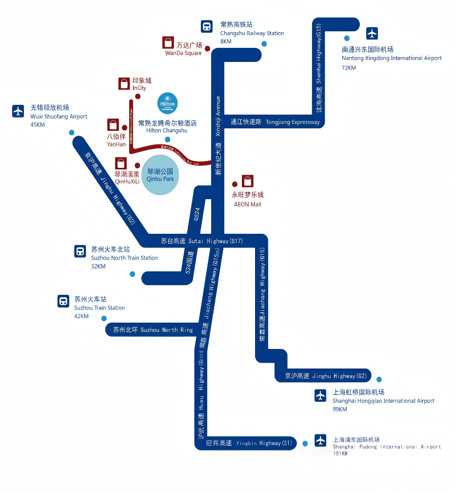If you arrive at Shanghai Hongqiao Airport (上海虹桥国际机场), please note that the airport is directly connected to Shanghai Hongqiao Railway Station (上海虹桥站). You can take a high-speed train from Shanghai Hongqiao Railway Station (上海虹桥站) to Changshu Railway Station (常熟高铁站), which takes about 1 hour. Then, take a taxi (please refer to the taxi note below for the destination details) to the Hilton Changshu (常熟龙腾希尔顿酒店).